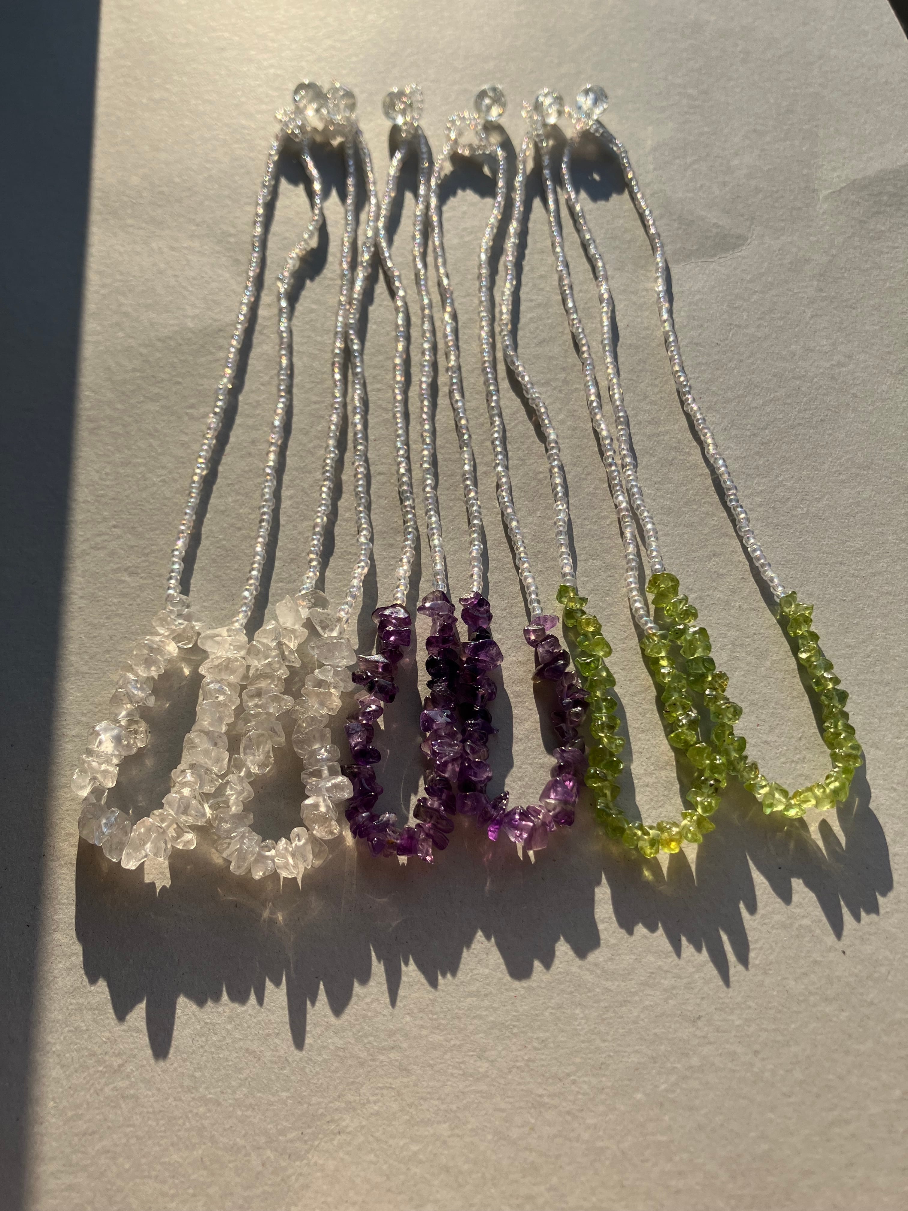 アメジスト/ペリドット/水晶40cmネックレスが登場しました!このエレガントなネックレスは、ビーズと天然石のみで作られており、金属を一切使用していません。金属アレルギーの方でも安心して1日中つけていただける設計です。