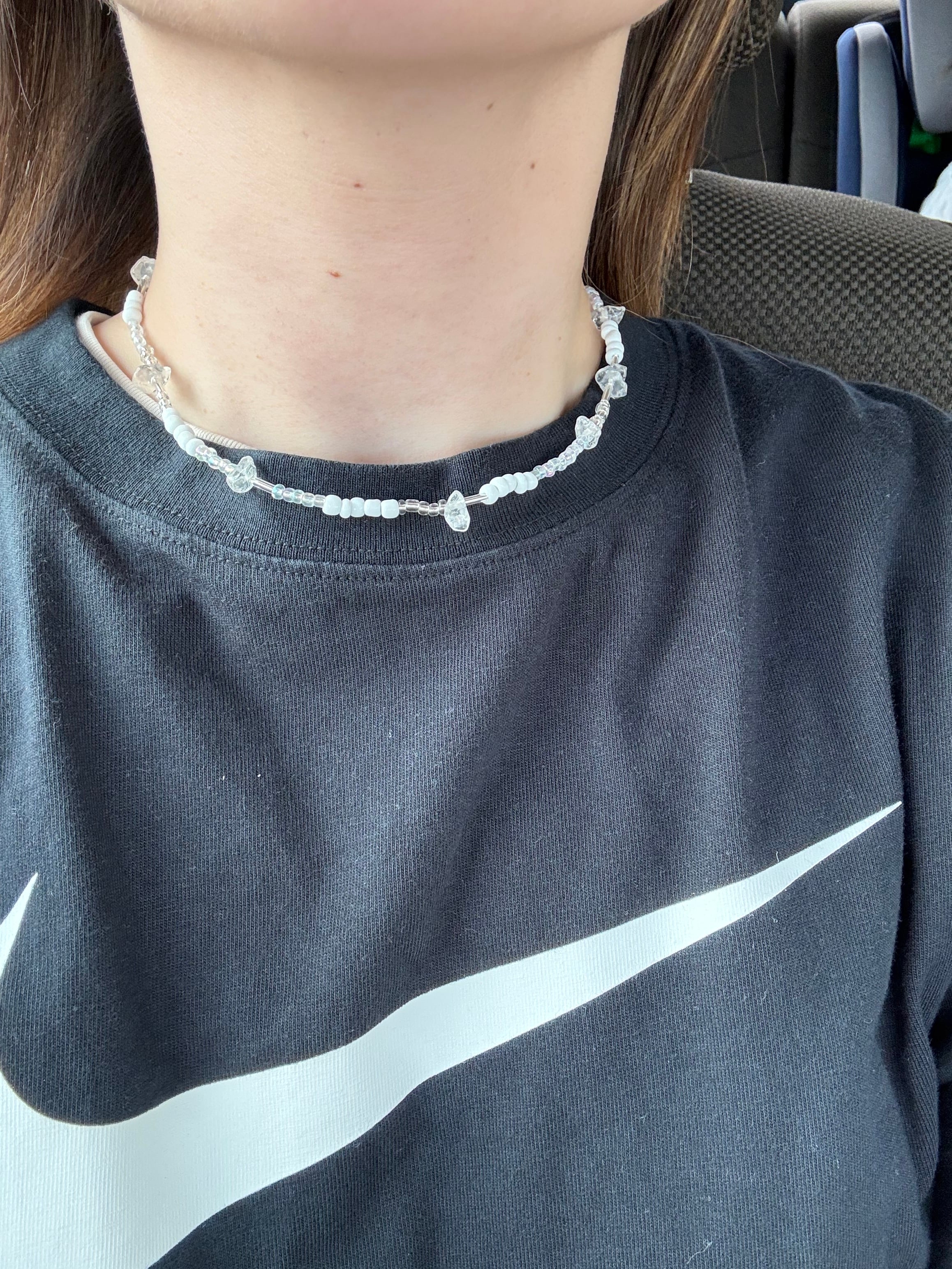 クリスタル/ホワイト/シルバーネックレス 38-39cmが登場しました!この魅力的なネックレスは、ビーズと天然石のみで作られており、金属を一切使用していません。金属アレルギーの方でも安心して1日中つけていただける設計です。