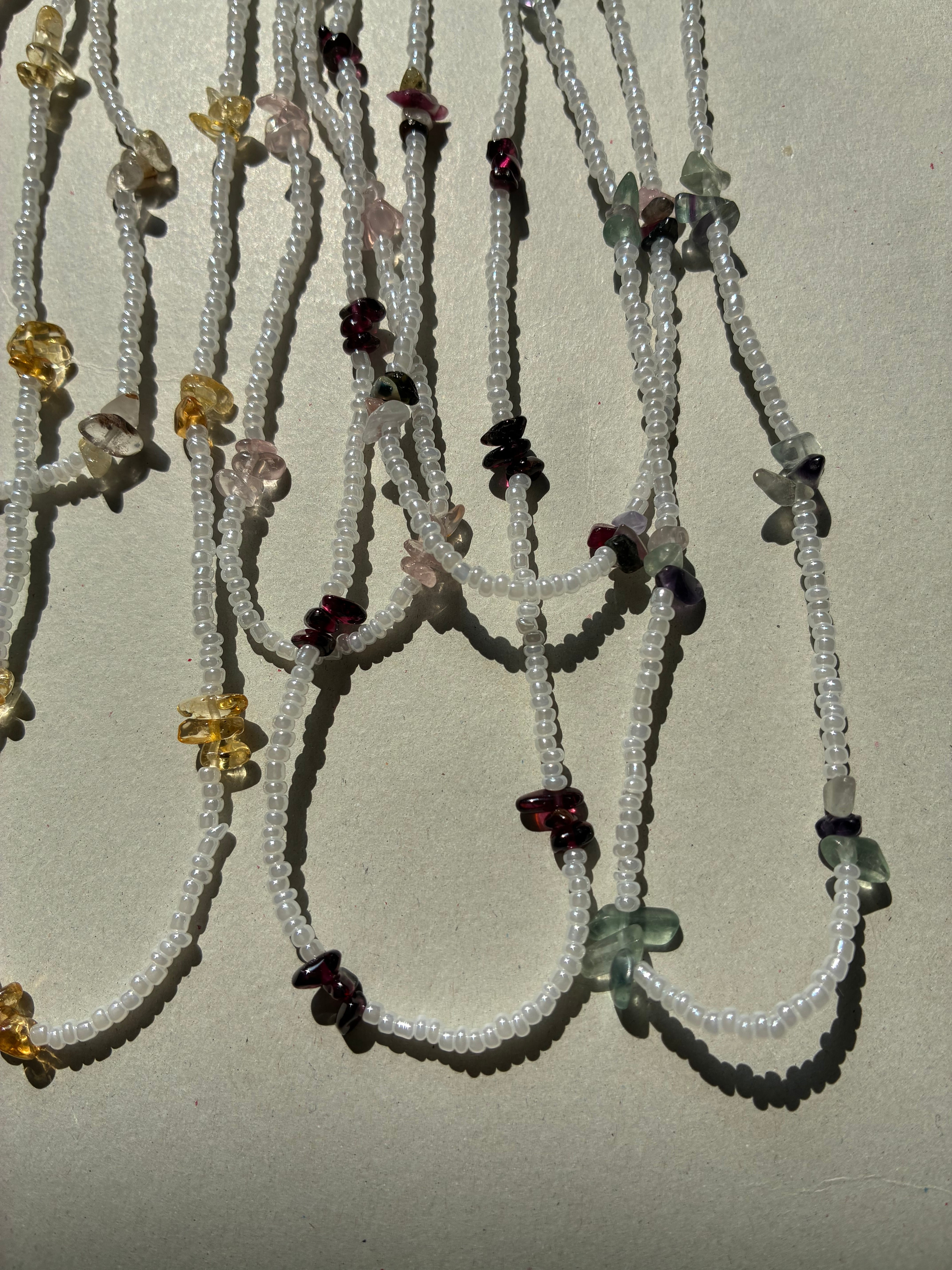 小粒天然石×ホワイト2mmビーズネックレス 38-39cmが登場しました!この魅力的なネックレスは、ビーズと天然石のみで作られており、金属を一切使用していません。金属アレルギーの方でも安心して1日中つけていただける設計です。