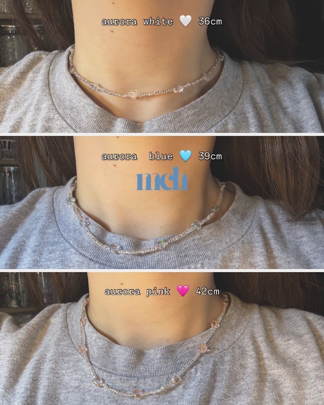 オーロラホワイト/ピンク/ブルーアクリルハートネックレスが登場しました!この魅力的なネックレスは、オーロラホワイト、ピンク、ブルーのアクリルビーズのみで作られており、金属を一切使用していません。金属アレルギーの方でも安心して1日中つけていただける設計です。