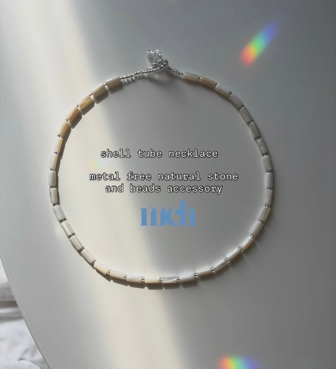 シェルチューブネックレスの詳細です。ビーズとシェルだけで丁寧に作られた、素敵なネックレスです。金属を一切使用していないため、金属アレルギーの方でも安心してお使いいただけます。