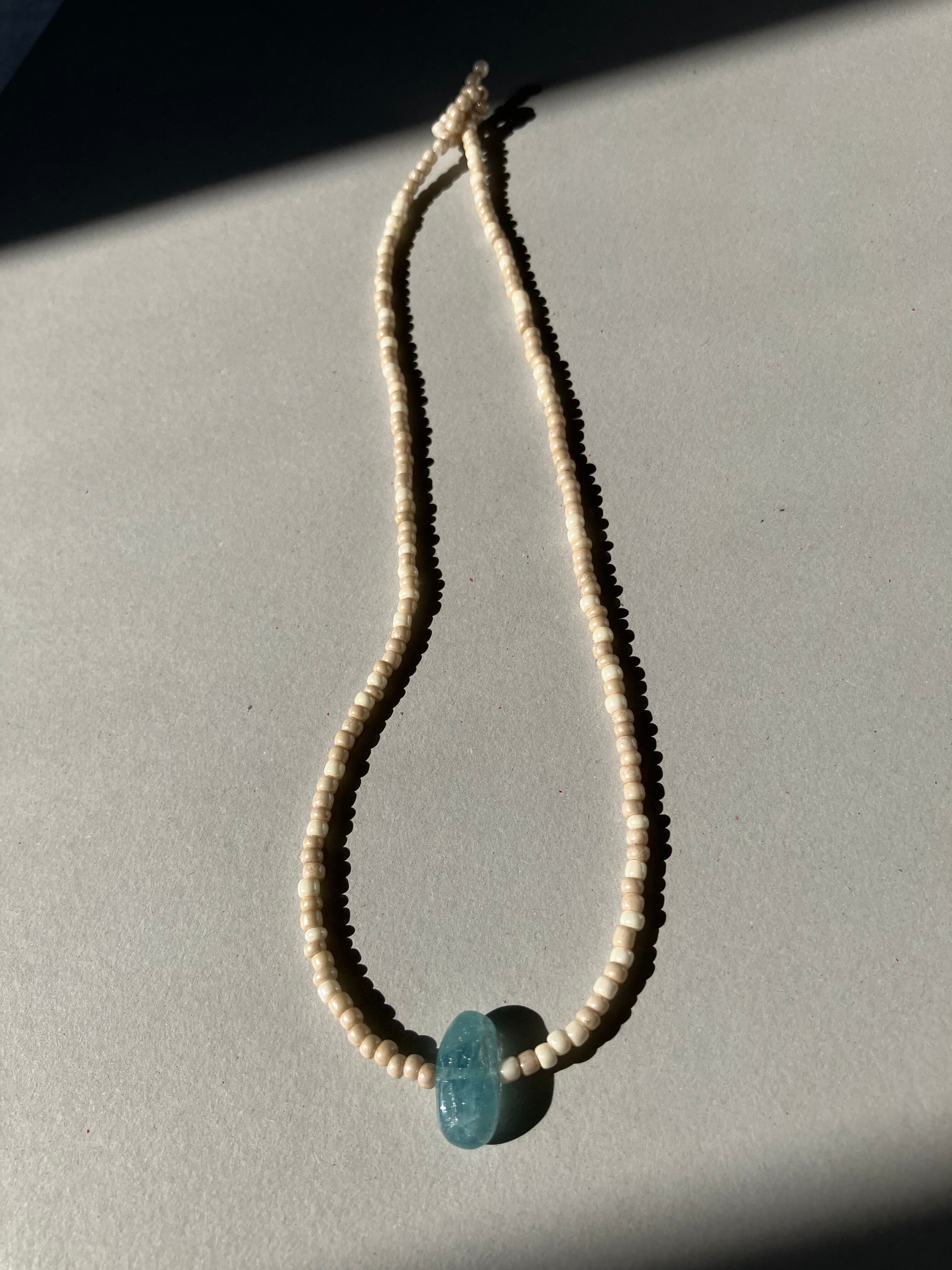 アクアマリンチャームネックレスが登場しました!この美しいネックレスは、アクアマリンチャームとビーズ、天然石のみで作られており、金属を一切使用していません。金属アレルギーの方でも安心して1日中つけていただける設計です。